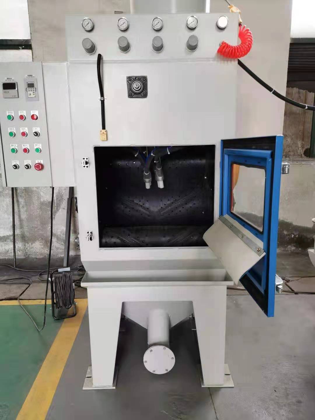 7、 由空轉計時器控制吹氣,可設定空轉吹氣時間,以清潔工件,并使砂材回收更徹底。