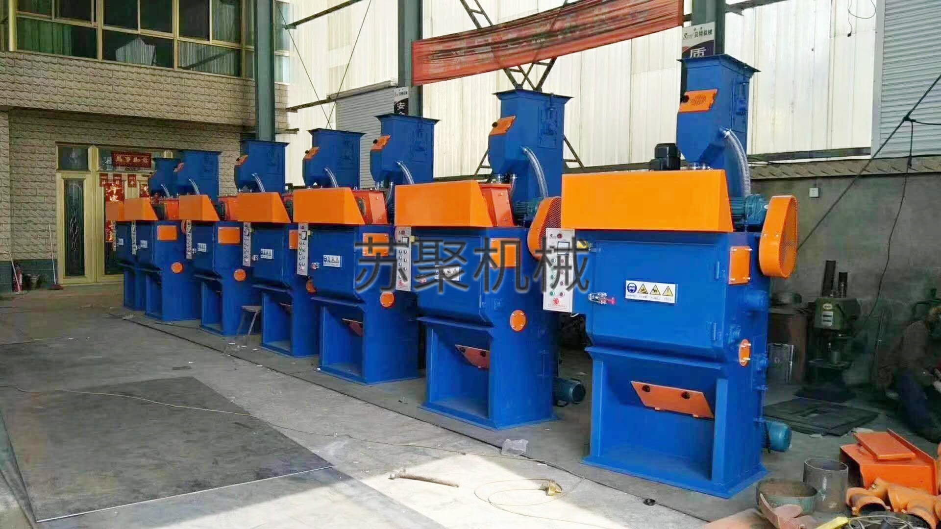 在清理室中加入規(guī)定數(shù)量的工件,機器啟動后,滾筒開始旋轉(zhuǎn),被清理的工件由橡膠履帶帶動在滾筒內(nèi)作連續(xù)均勻的翻轉(zhuǎn),同時拋丸器高效