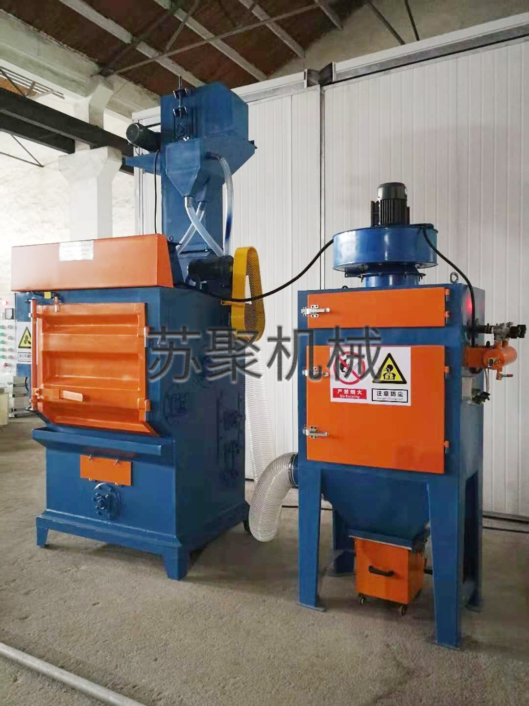 在清理室中加入規(guī)定數(shù)量的工件,機(jī)器啟動后,滾筒開始旋轉(zhuǎn),被清理的工件由橡膠履帶帶動在滾筒內(nèi)作連續(xù)均勻的翻轉(zhuǎn),同時(shí)拋丸器高效拋出彈丸形成扇形彈束,均勻的打在工件表面上,從而達(dá)到清理和強(qiáng)化的目的。拋出的彈丸及砂粒,經(jīng)橡膠履帶均勻排布的小孔流入清理室底部的鋼板篩上,鋼板篩將較大顆粒篩出鋼丸及細(xì)砂落至篩下的螺旋輸送器,被送入提升機(jī)內(nèi),由提升機(jī)提至丸砂分離器中進(jìn)行分離,粉塵由風(fēng)機(jī)吸送至濾筒式除塵器內(nèi)經(jīng)濾筒過濾,清潔空氣排放大氣,濾筒上的灰塵有脈沖反吹落入除塵器下部集塵箱內(nèi),定期除塵。舊砂經(jīng)流砂管流入廢砂桶內(nèi)(用戶自備)。由分離器中鋼板篩篩下的較大顆粒與未能分離完成的丸砂混合物,經(jīng)流丸管流入清理室。重新參加分離,分離后干凈的彈丸,經(jīng)流丸管再次流入拋丸器內(nèi)重新開始拋丸工作。